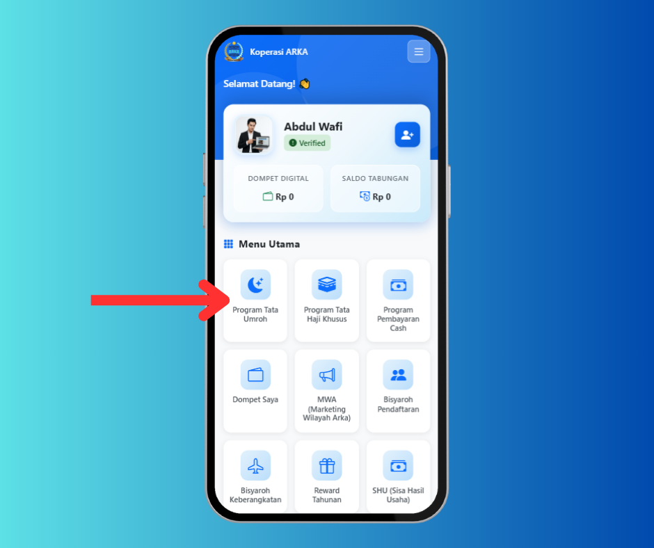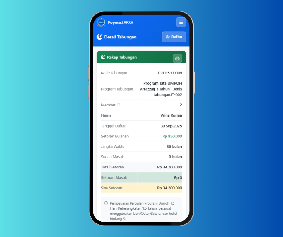 Selanjutnya Anda dapat memilih dan mendaftar salah satu Program Tabungan Koperasi Arka seperti Program Tata Umroh, Program Pembayaran Cash, Program Dantal Umroh, Program Tata Haji Khusus. Semua proses pembayaran dan informasi tersedia di Aplikasi Arka.