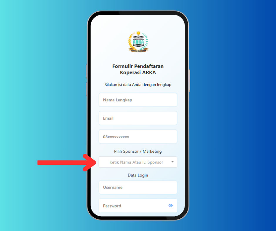 Setelah berhasil install aplikasi Koperasi Arka di handphone Android Anda. Selanjutnya lakukan Registrasi dan lengkapi data pada form yang tersedia pada Aplikasi yang terdiri dari Nama Lengkap, Email, No. Handphone, Nama Sponsor, Username dan Password. Pada kolom Pilih Sponsor/Marketing silahkan klik dan ketikan nama sponsor atau bisa juga menetikan member id sponsor yang telah mengajak anda bergabung dengan Koperasi Arka. Jika tidak ada sponsor yang mengajak bergabung, Anda bisa mengetikan Member ID 1 atas nama Cecep Muhammad