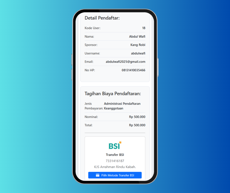 Setelah Pendaftaran Berhasil, selanjutnya lakukan pembayaran biaya administrasi Keanggotaan Koperasi Arka, klik tombol Lanjutkan Pembayaran dan ikuti proses pembayaran yang telah kami sediakan. Anda dapat memilik 2 metode pembayaran diantaranya via Manual transfer bank BSI dan via Otomatis Virtual Account Midtrans.